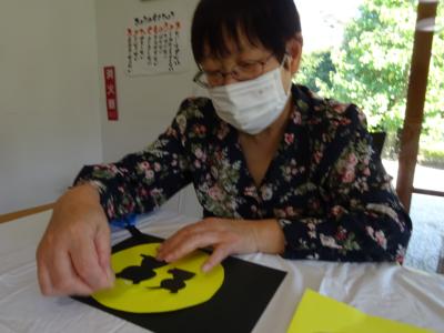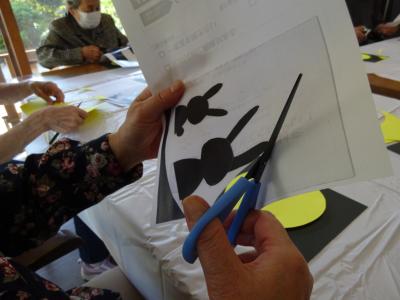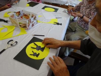 では、黒い厚紙に満月とウサギをのりで貼っていきます