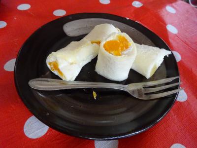 そうです、果物を乗せ終わったら、パンをロールケーキのように