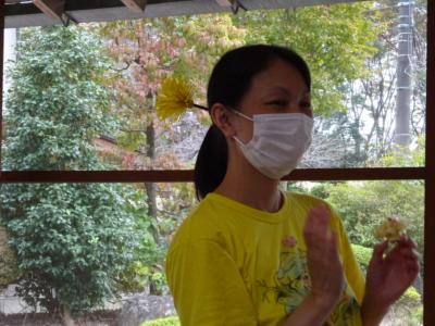 優勝賞品は、職員手作りのコサージュ(手に持っている)とお花(頭に刺してる)です