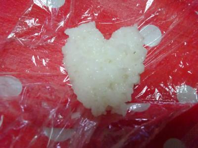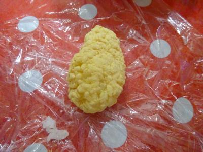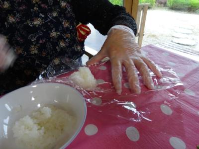 それでは、ラップでもち米を俵状に、握りましょう