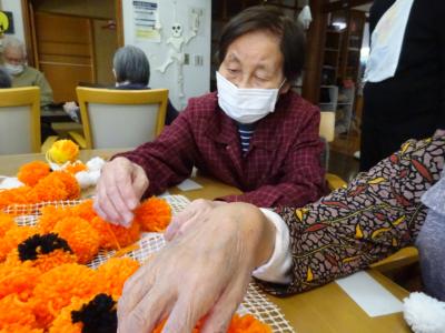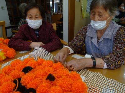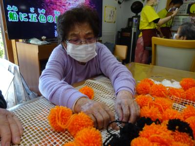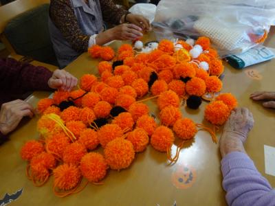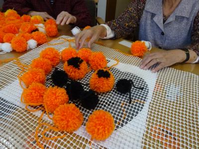 沢山のポンポンを使って大きなカボチャを作って下さっていらしゃるお母様方るんるん (音符)