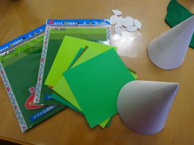 木の形をした画用紙を丸めたものに葉っぱを貼っていきます