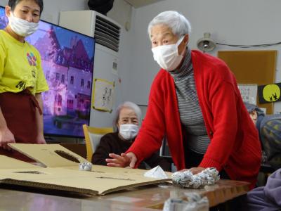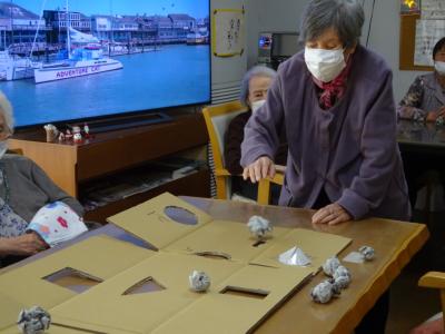 形の空いた段ボールに、新聞紙ボールを飛ばしてゲームをします