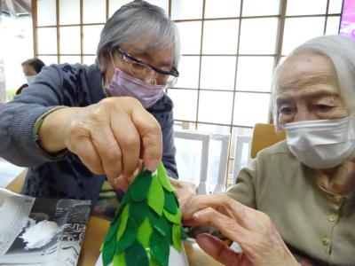 円錐の厚紙にフェルトを葉っぱの形に切って、貼っていきます