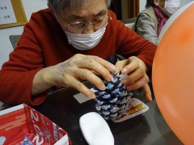 お次が、大きな松ぼっくりにぽんぽんやビーズを