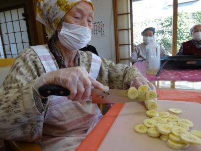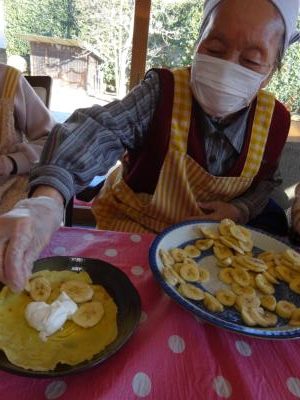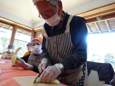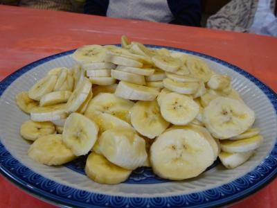皆様が焼いて下さる間に、クレープの中に入れるバナナを