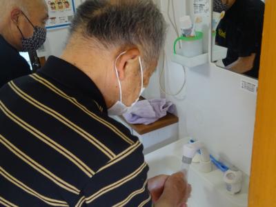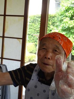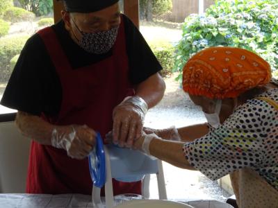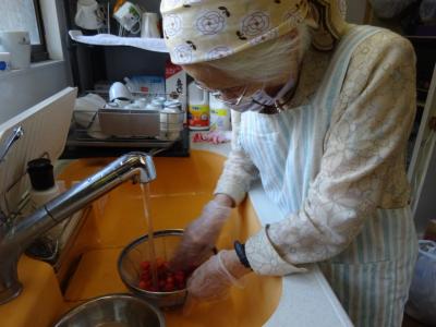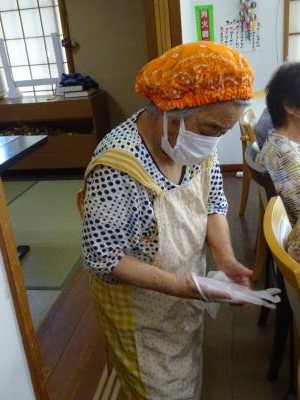 手を洗ったら、エプロンに三角巾とマスクを装着